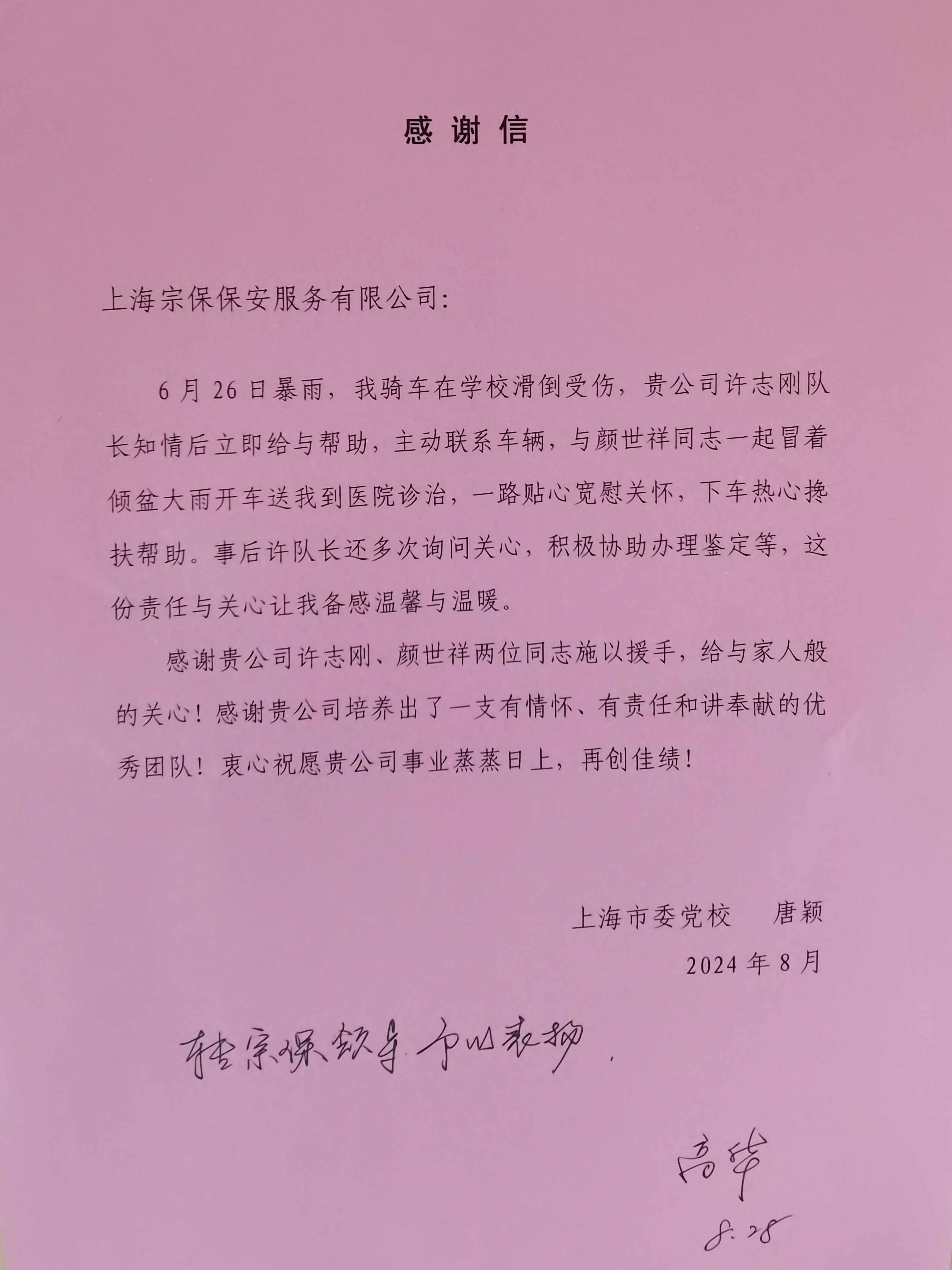 8月28日,宗保公司駐徐匯區市委黨校項目收到黨校老師唐女士送來(lái)的一封感謝信,感謝公司員工許志剛和顏世祥熱心助人的行為。