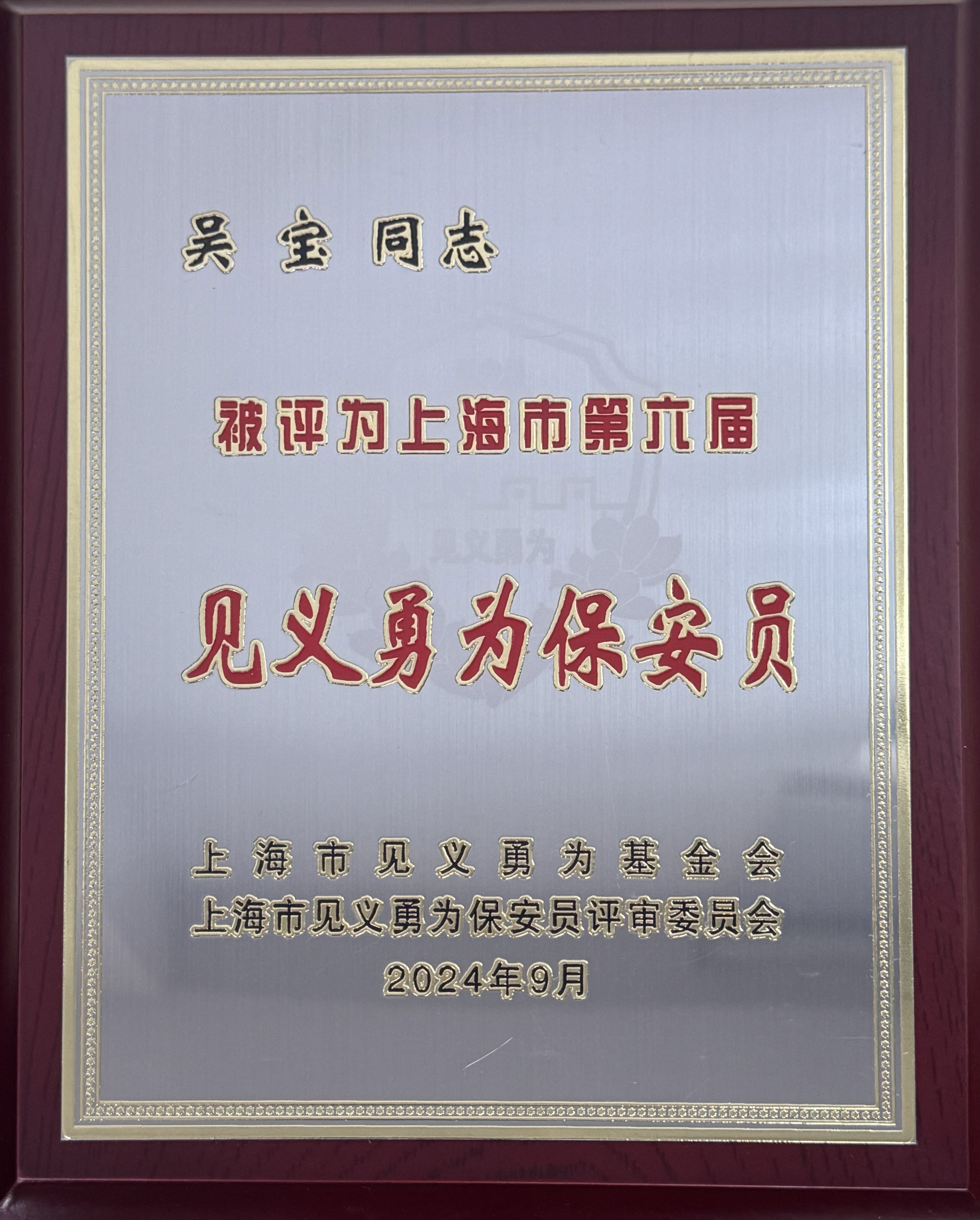2024年9月27日,上海市見(jiàn)義勇為基金會(huì )在上海市司法局三樓會(huì )議室召開(kāi)2024年二三季度見(jiàn)義勇為先進(jìn)評選表彰發(fā)布會(huì )。會(huì )上,上海宗保保安服務(wù)有限公司員工管旭峰、凌邵凱、吳寶和鄧江峰被評為上海市第六屆“見(jiàn)義勇為保安員”。