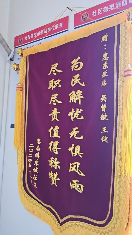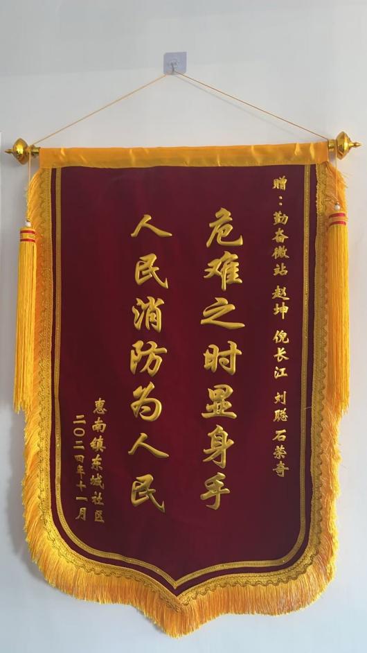 浦東新區惠南鎮勤奮微站獲贈繡有“危難之時(shí)顯身手 人民消防為人民”的錦旗