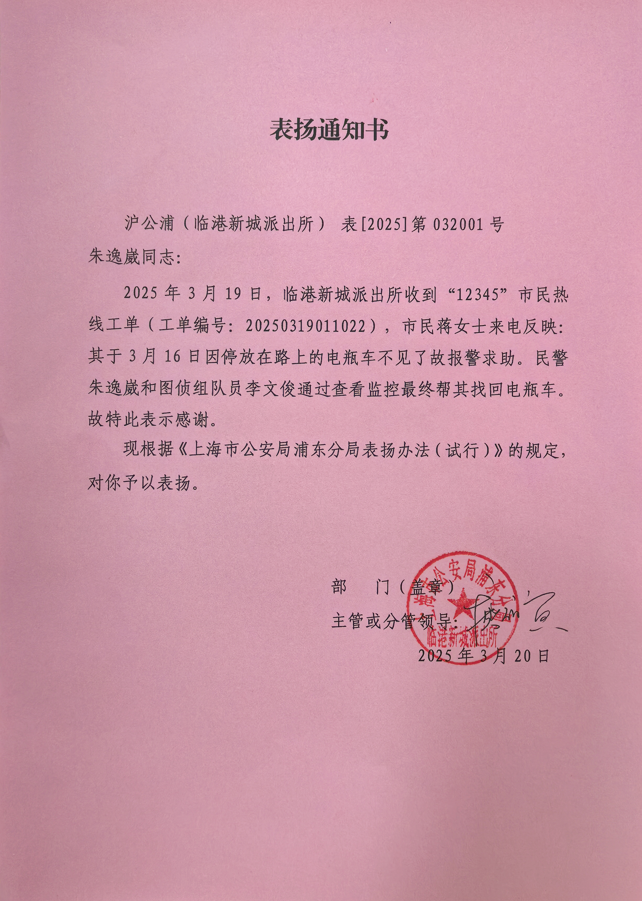 近日,宗保公司駐浦東新區臨港派出所輔助項目員工李文俊因幫助市民蔣女士成功找回被盜電瓶車(chē),受到了臨港新城派出所的表?yè)P,并贏(yíng)得了市民的高度贊譽(yù)。