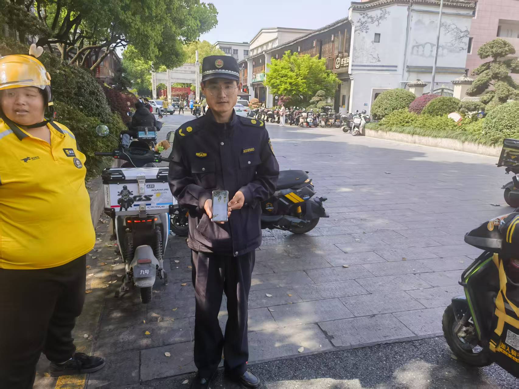 4月6日14:19,浙江民泰公司駐杭州市臨平區塘棲市容項目員工陳亞會(huì )和梁小睿在塘棲古鎮景區門(mén)口執勤時(shí),撿到一部小米手機,報告城管中隊值班領(lǐng)導后,便在原地等待失主。