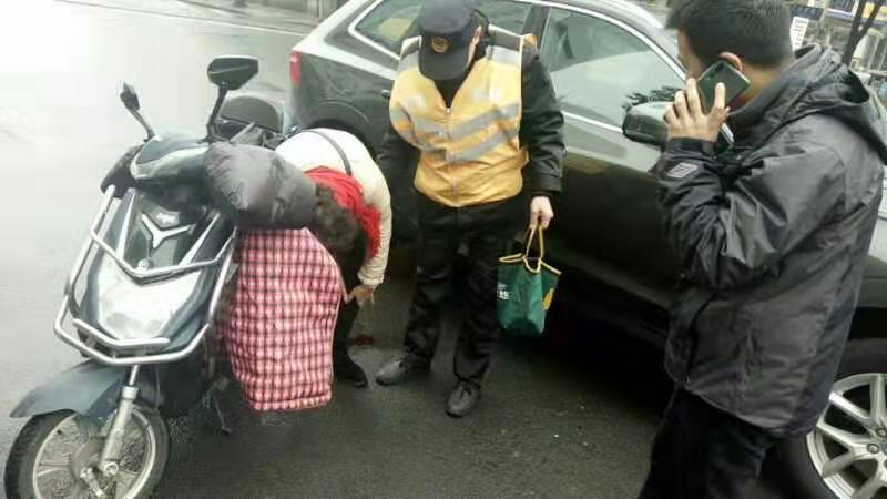 當日08:15左右,金橋市容項目隊員孫雪曉、馮建平巡邏至浙橋路金新路口時(shí),突然聽(tīng)到一聲猛烈撞擊聲,在不遠處發(fā)生了一起電動(dòng)車(chē)與汽車(chē)碰撞的交通事故。二人一邊上報情況,一邊奔向事故現場(chǎng)。只見(jiàn)騎電動(dòng)車(chē)女子倒地,一條腿被壓在電動(dòng)車(chē)下面,不能動(dòng)彈。小孫和小馮挪開(kāi)電動(dòng)車(chē)停好,扶受傷女子坐起,發(fā)現她左腿血流不止,小孫對其腿部進(jìn)行了簡(jiǎn)易包扎,并致電120尋求救助。