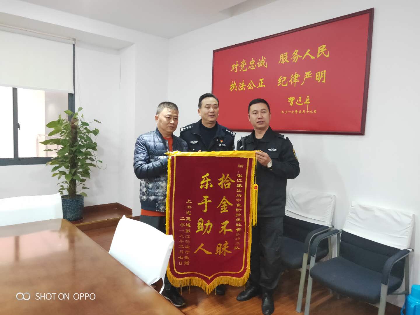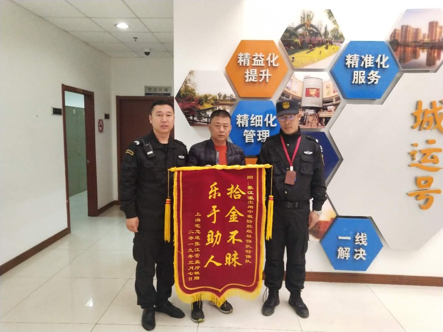 2019年3月21日,宅急送張江營(yíng)業(yè)廳代表將一面繡有“拾金不昧,樂(lè )于助人”的錦旗,送到宗保公司駐張江派出所項目隊長(cháng)袁飛的手中,以表示對宗保隊員的感謝。