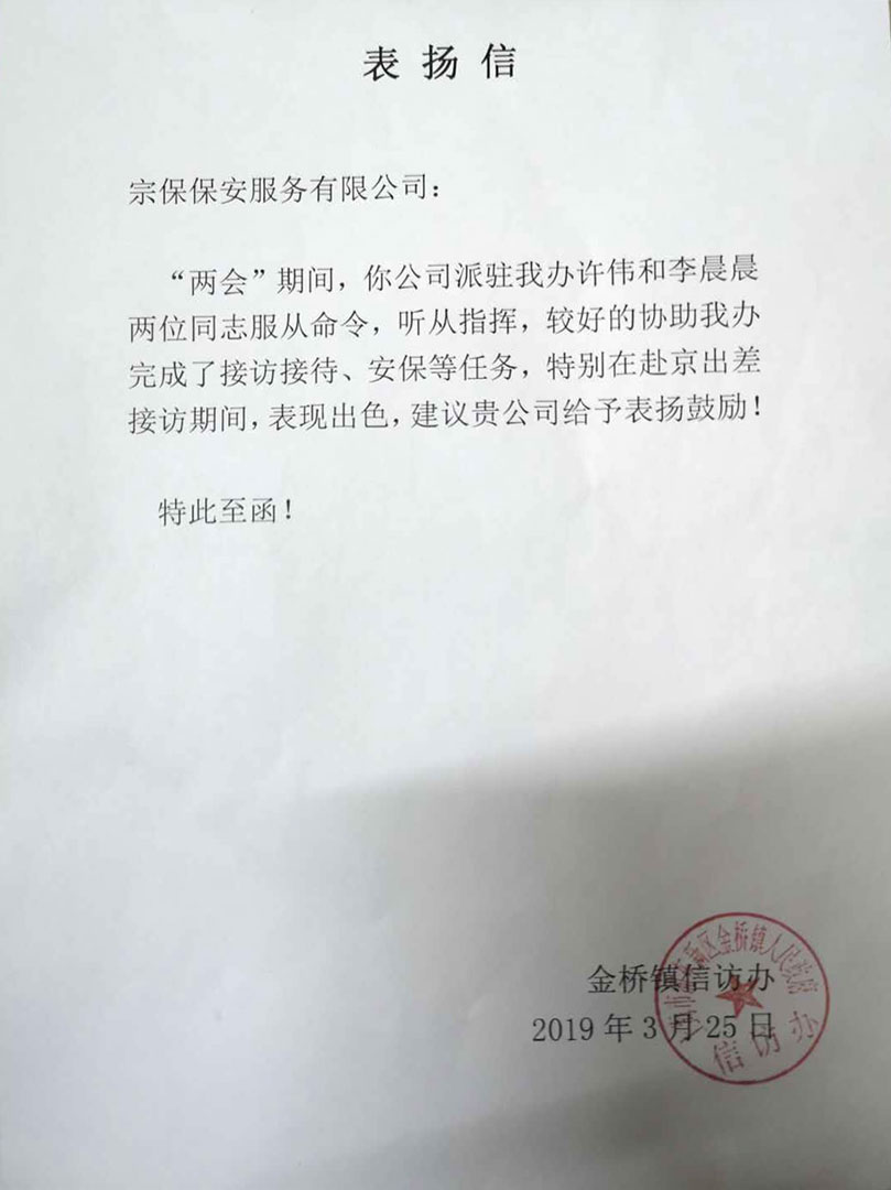 2019年3月25日,宗保駐金橋輔警項目收到一封來(lái)自金橋鎮人民政府信訪(fǎng)辦的表?yè)P信。
