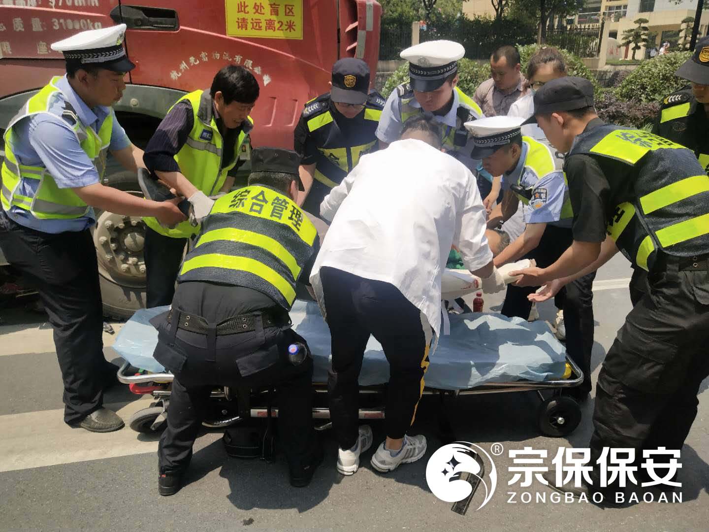 當日上午10:50分左右,民泰隊員巡查至余杭區閑林街道閑富北路時(shí),發(fā)現前方發(fā)生了一起電動(dòng)車(chē)與工程車(chē)相撞的交通事故。隊員們立即向事故現場(chǎng)奔去并報告上級請求支援?,F場(chǎng)特保隊員詢(xún)問(wèn)傷者傷勢情況并安撫其情緒,協(xié)助報警叫救護車(chē)。隨著(zhù)增援隊員的趕來(lái),隊員們分工積極指揮現場(chǎng)交通,維護現場(chǎng)秩序,避免發(fā)生二次事故。