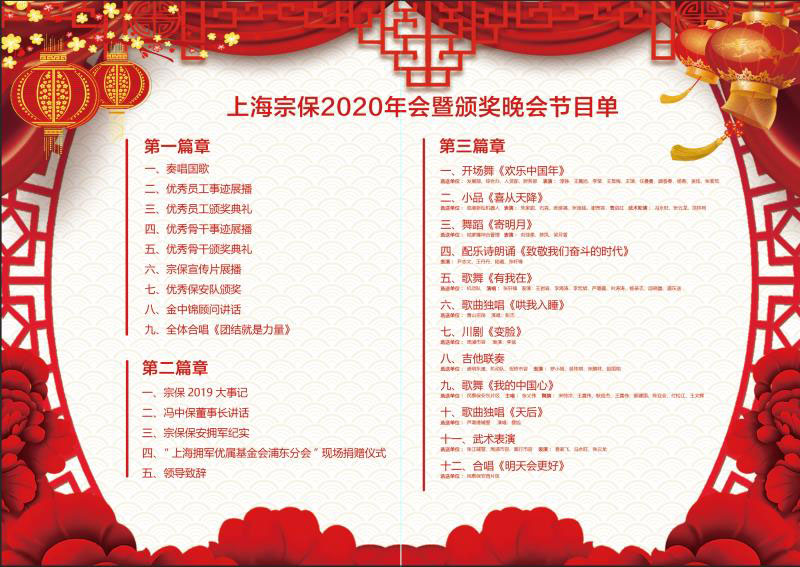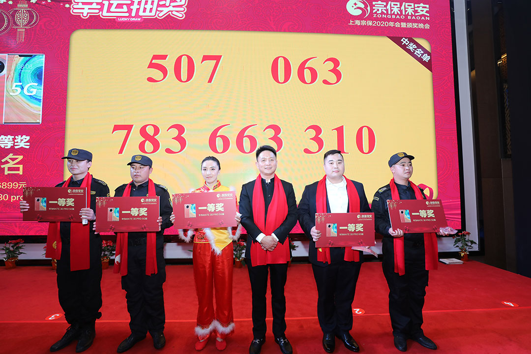 12月28日下午,上海宗保保安服務(wù)有限公司2020年會(huì )暨頒獎晚會(huì )在上海市浦東新區申江南路4888號維納斯國際酒店舉行。公司董事長(cháng)馮中保、上海宗保公司總經(jīng)理晏軍、浙江民泰公司總經(jīng)理楊定軍、鷹飛航空公司總經(jīng)理王耀、宗??萍脊究偨?jīng)理楊璞、黃山浦華公司總經(jīng)理謝啟鳳、安徽分公司總經(jīng)理蔣德玉、南京分公司總經(jīng)理劉長(cháng)虎等高層管理人員,公司總部及各分公司共計565名員工和部分特邀嘉賓歡聚一堂,共同迎接新年的到來(lái)。