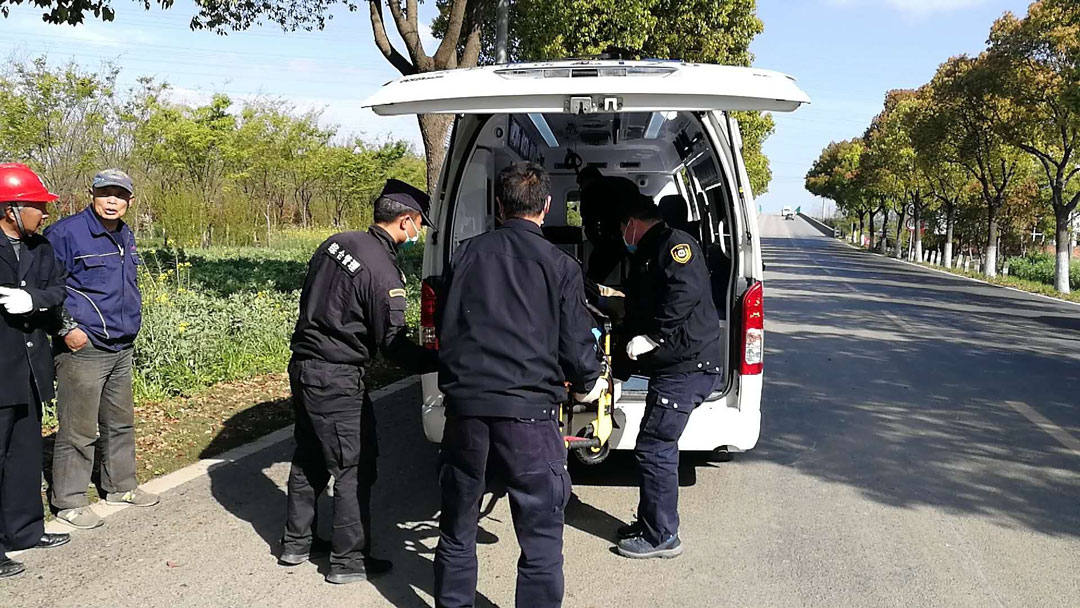 事不宜遲,為避免不當的施救對其造成二次傷害,小張和小賈立即撥打110和120,并聯(lián)系受傷者家屬。隨后,民警和120急救車(chē)趕到現場(chǎng)。兩名隊員協(xié)助醫護人員把傷者抬上救護車(chē)。