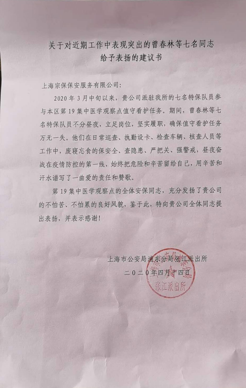 4月13日,宗保公司駐三林鎮市容項目收到楊思派出所送來(lái)的一封表?yè)P信,信中對三林鎮市容項目參與XX酒店集中醫學(xué)觀(guān)察點(diǎn)值守看護任務(wù)的宗保隊員提出表?yè)P和感謝。