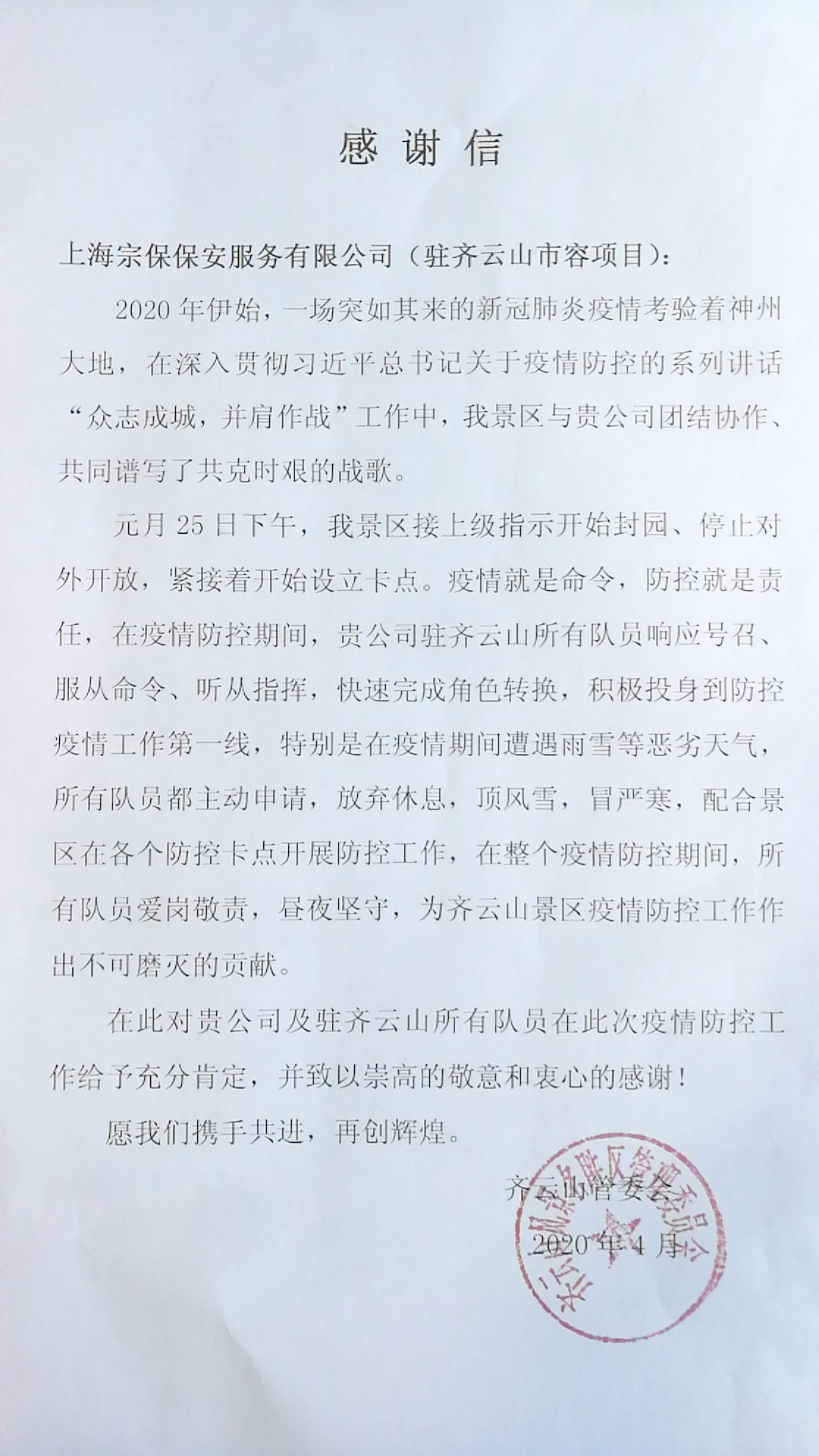 4月16日,宗保公司駐黃山區域齊云山市容項目收到齊云山管委會(huì )的一封感謝信,對在疫情防控期間付出辛勞的宗保隊員們表示肯定和感謝。