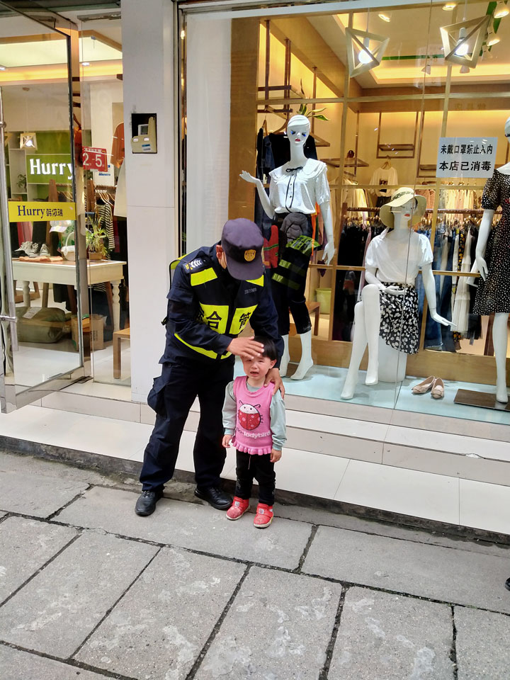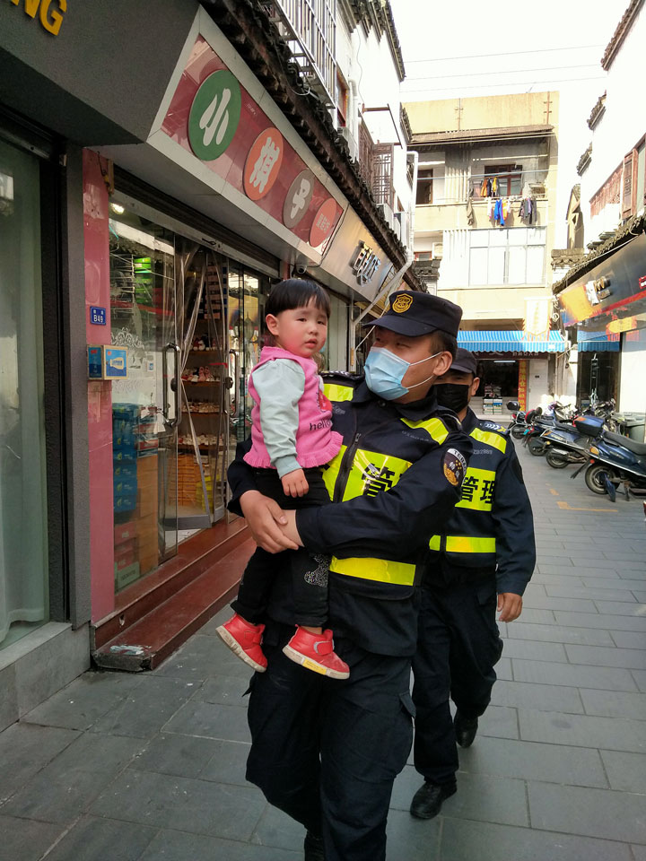 4月22日,宗保公司駐黃山歙縣市容項目隊員程帥強、米楊楊巡邏至古城步行街一家女裝店門(mén)口時(shí),一個(gè)小女孩的哭聲引起了二人的注意,小女孩看上去大概三歲多的樣子,哭著(zhù)說(shuō)要找奶奶。