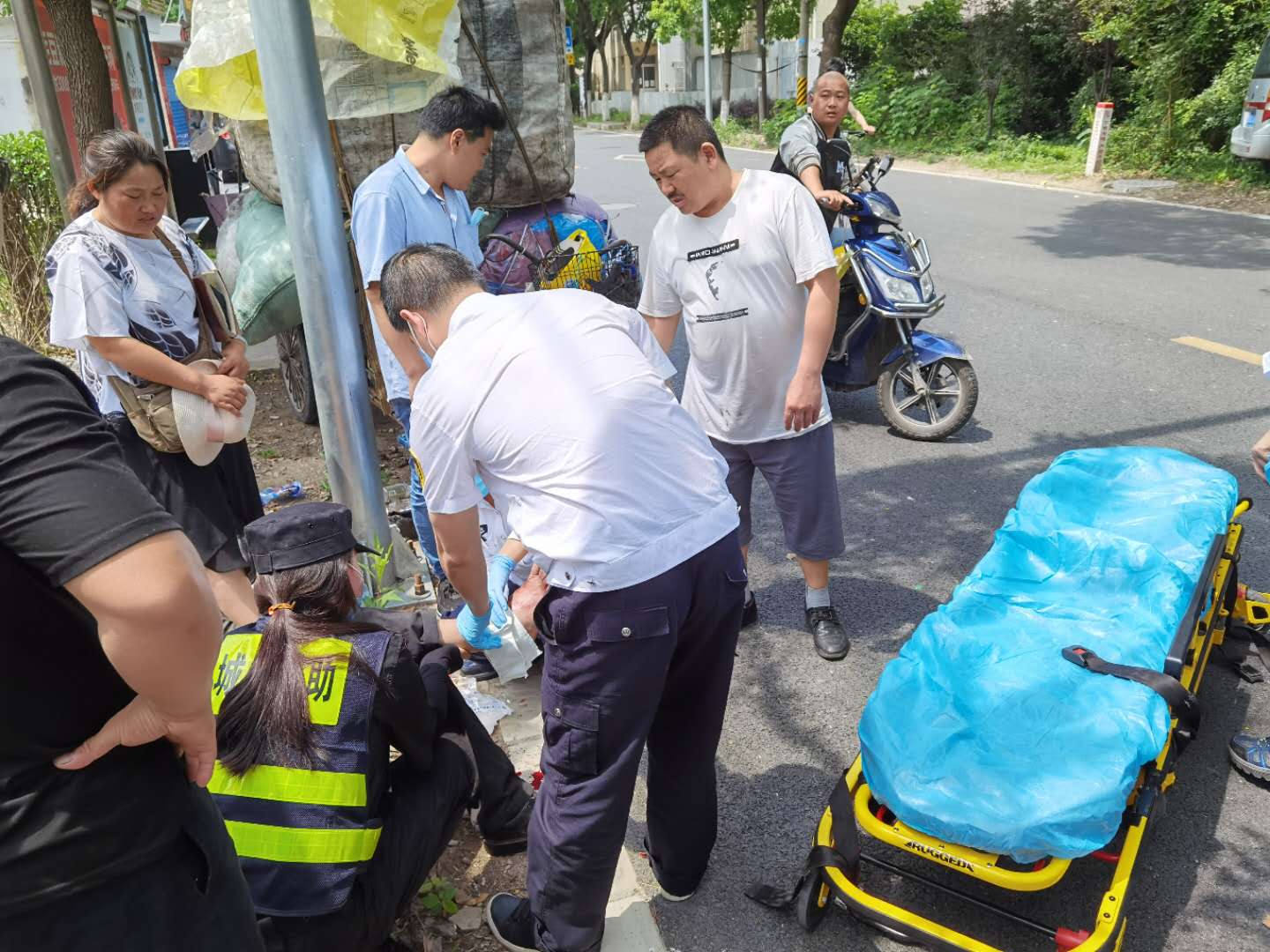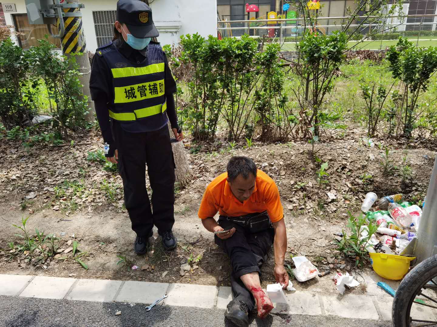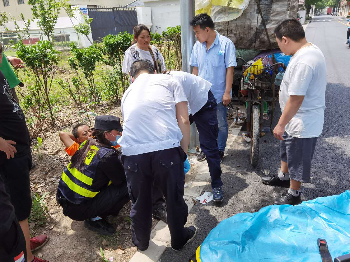 宗保公司駐周浦市容五組隊員吳吉喆剛好巡邏至此,急忙上前查看,老人身體多處受傷,且傷勢嚴重流血不止。原來(lái)是因為三輪車(chē)搭載過(guò)重,老人力氣不足,無(wú)法控制車(chē)輛,才導致事故的發(fā)生。小吳把老人攙扶起身,撥打120急救電話(huà),并緊急通知附近崗位執勤隊員前來(lái)支援。