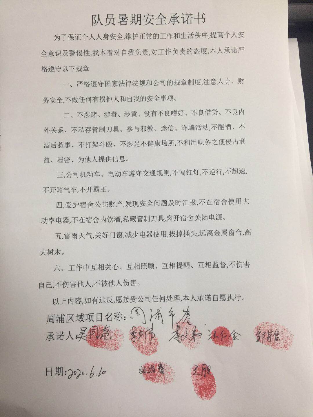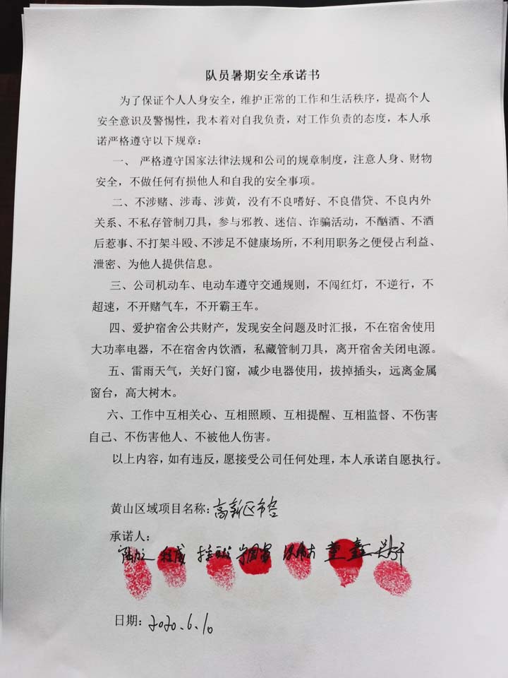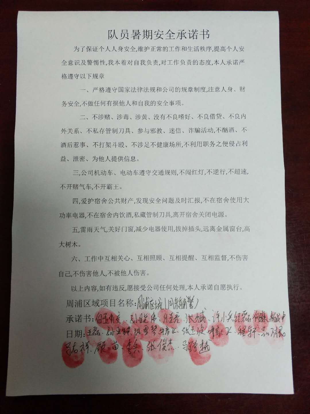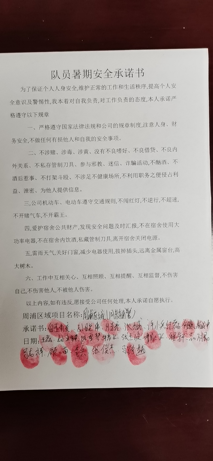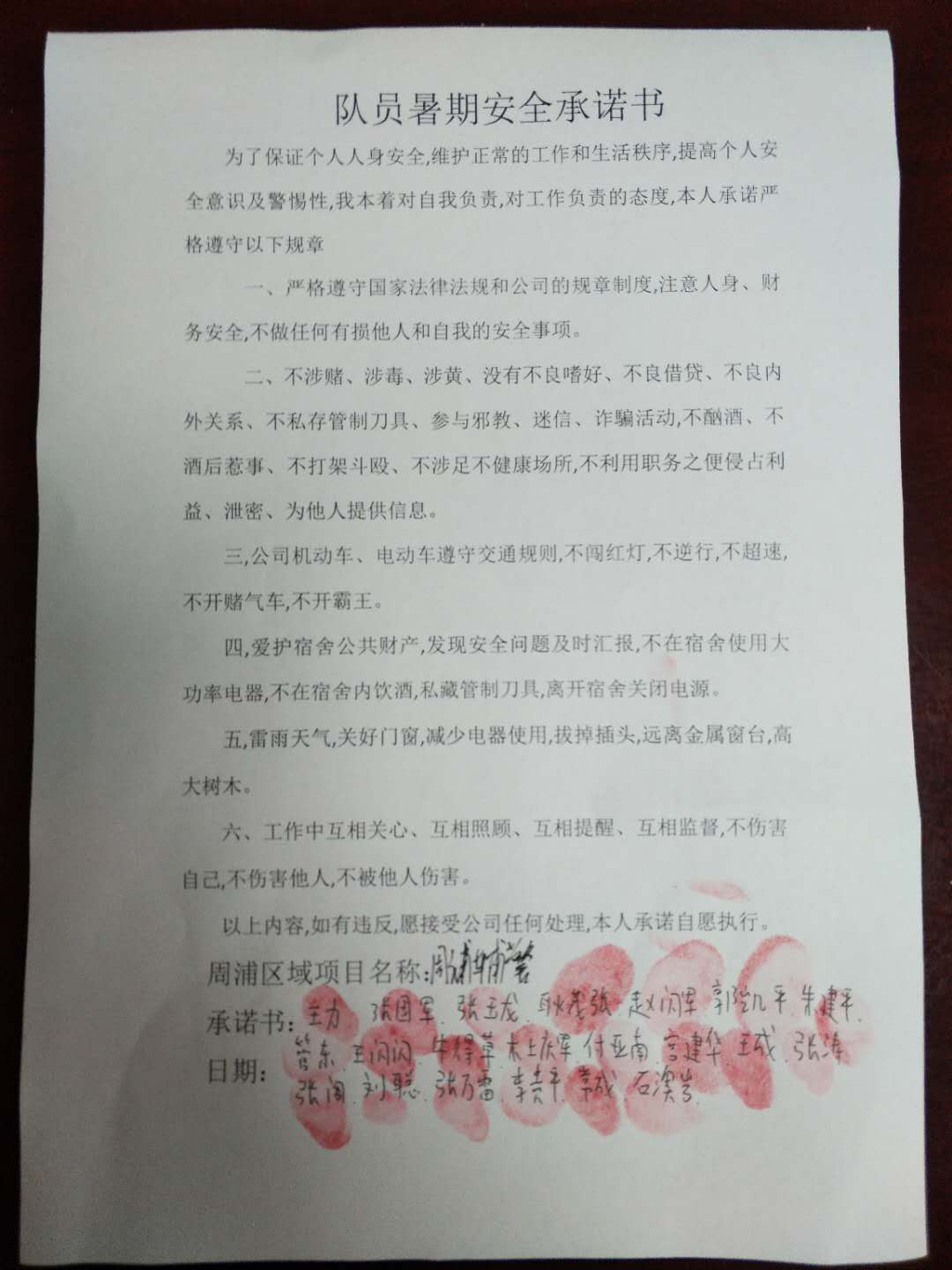全體員工認真學(xué)習領(lǐng)會(huì )公司暑期安全工作部署會(huì )精神,思想上高度重視,行動(dòng)上堅定自覺(jué),各項目骨干帶頭與隊員簽訂暑期安全承諾書(shū),強化責任意識,筑牢安全防線(xiàn),堅守安全底線(xiàn),確保平穩度夏。