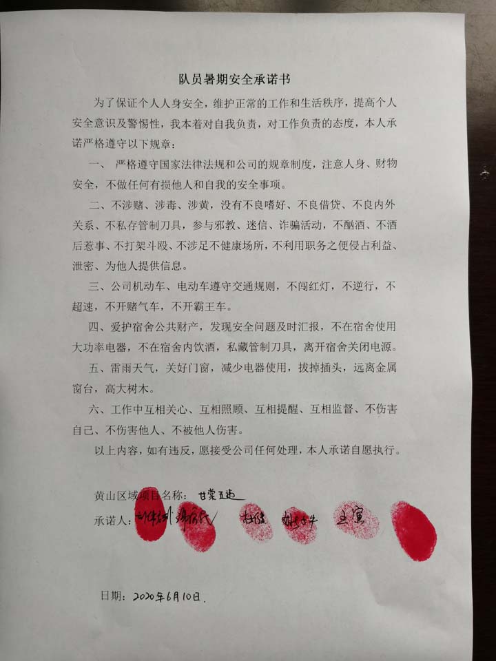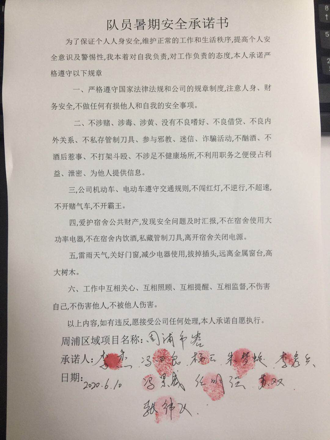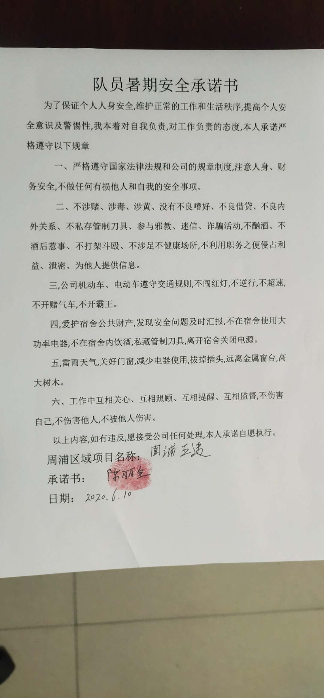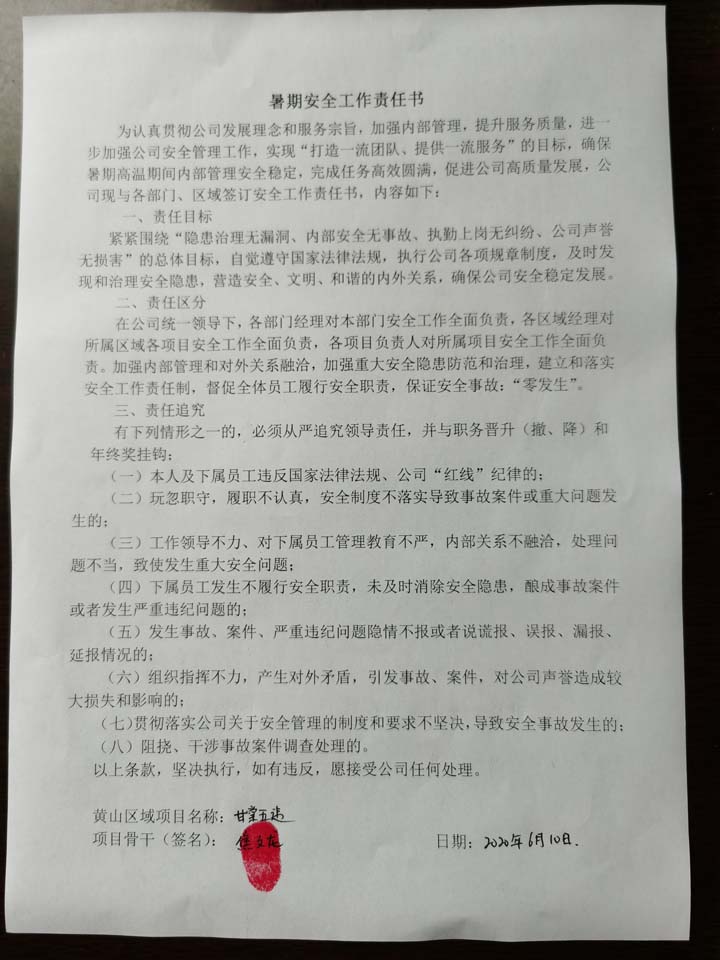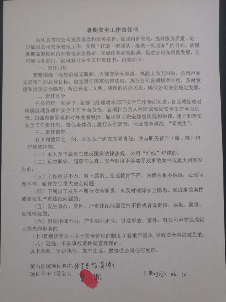 全體員工認真學(xué)習領(lǐng)會(huì )公司暑期安全工作部署會(huì )精神,思想上高度重視,行動(dòng)上堅定自覺(jué),各項目骨干帶頭與隊員簽訂暑期安全承諾書(shū),強化責任意識,筑牢安全防線(xiàn),堅守安全底線(xiàn),確保平穩度夏。