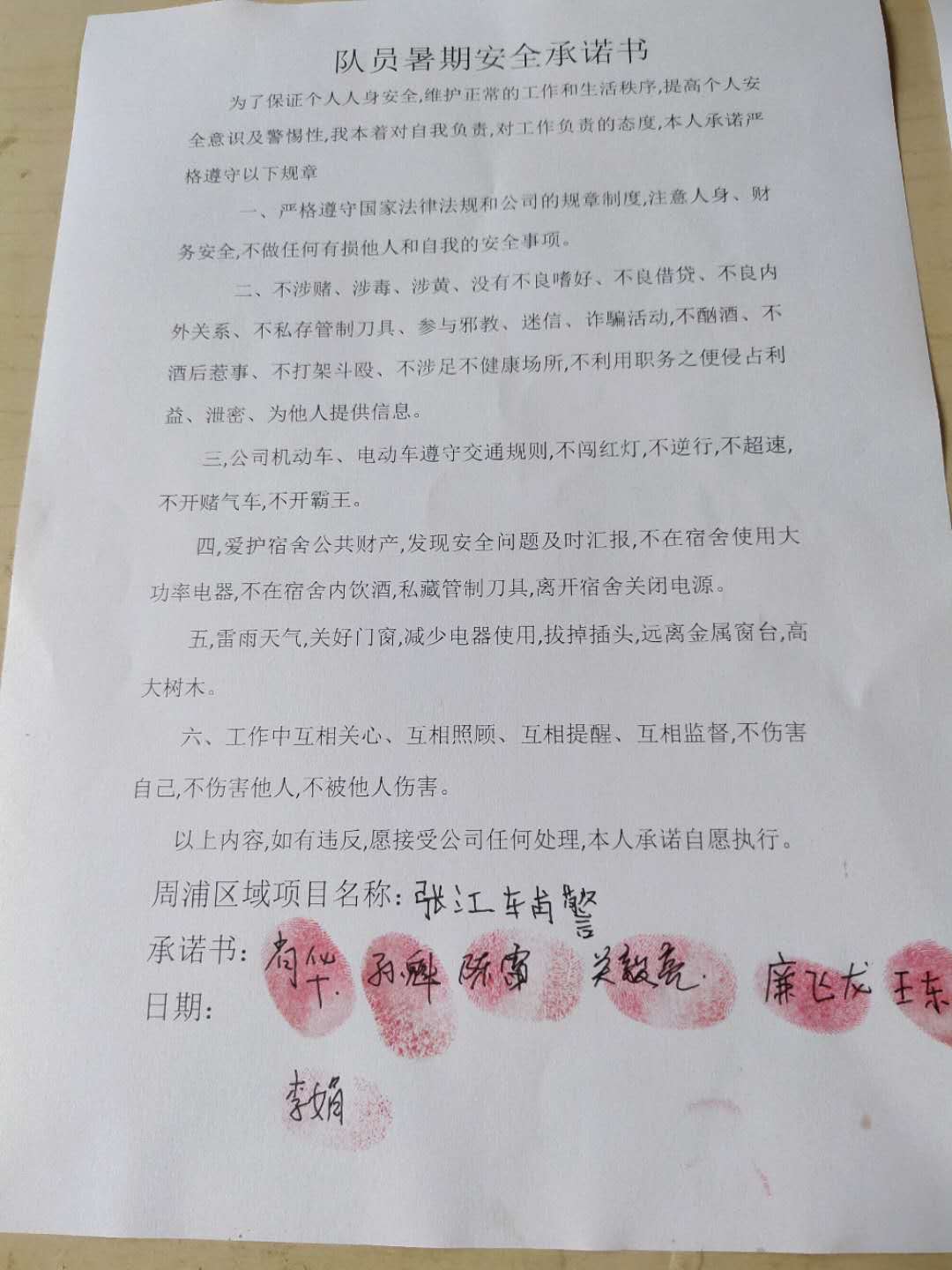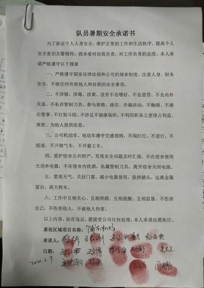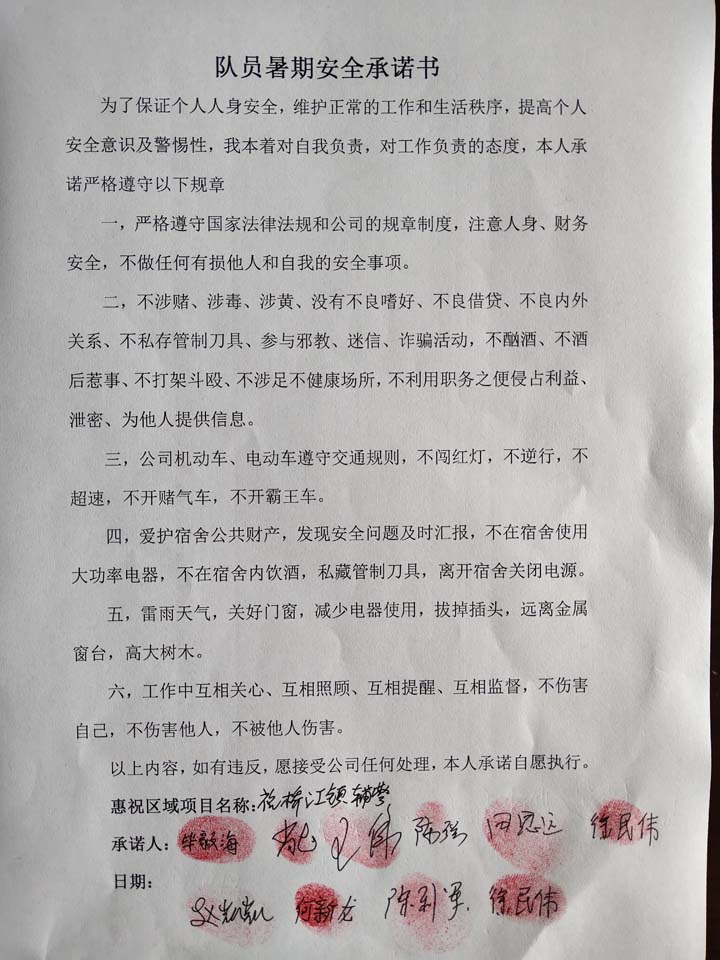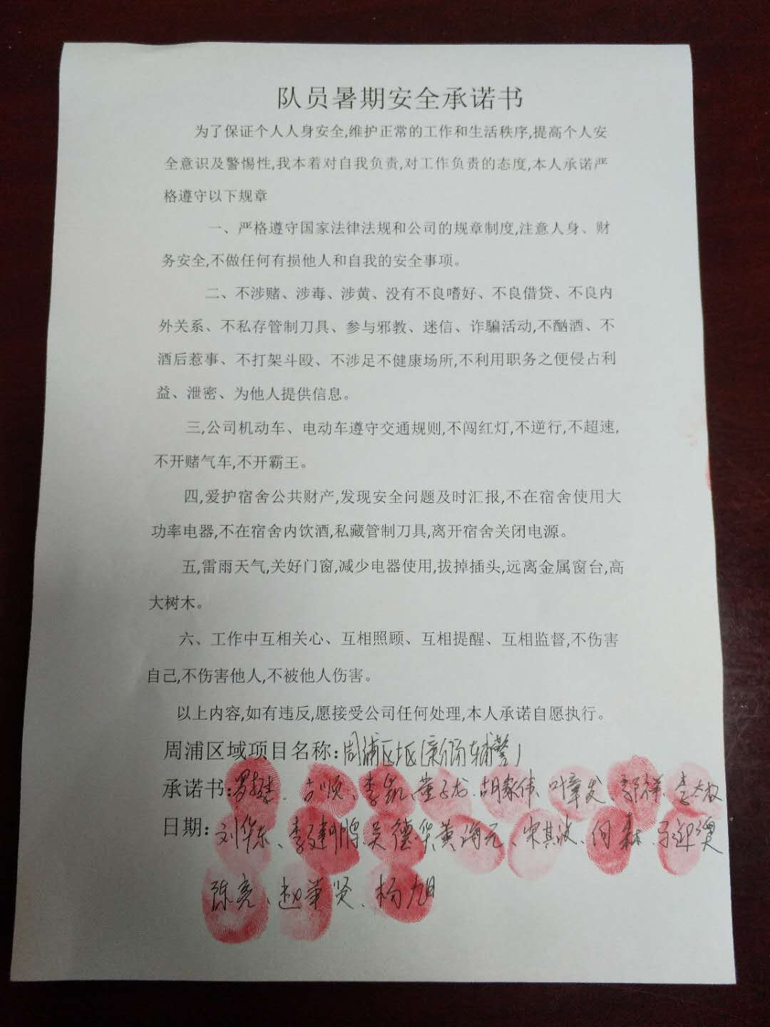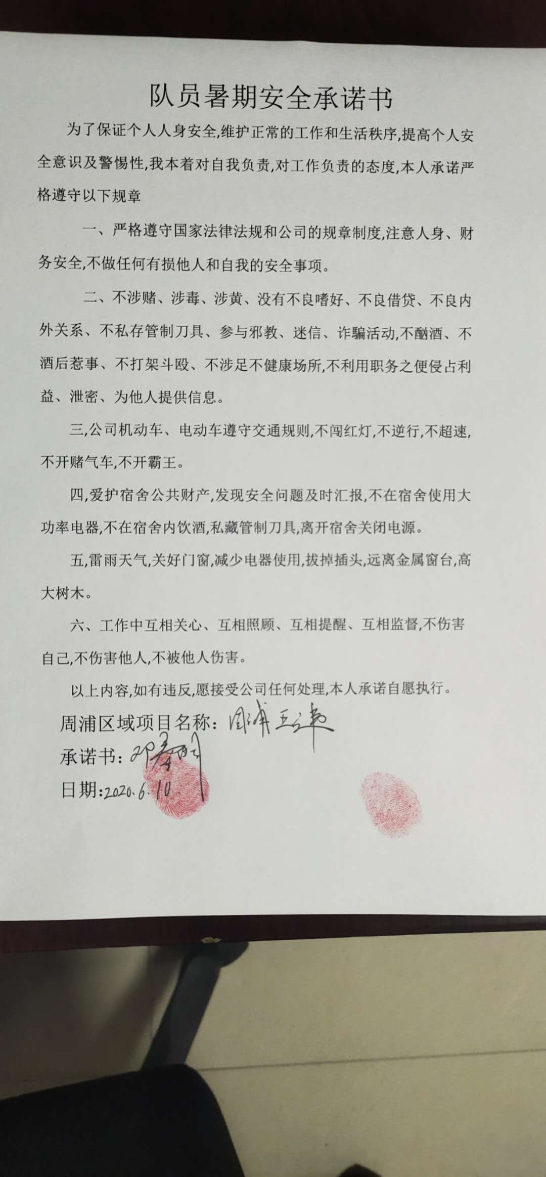 全體員工認真學(xué)習領(lǐng)會(huì )公司暑期安全工作部署會(huì )精神,思想上高度重視,行動(dòng)上堅定自覺(jué),各項目骨干帶頭與隊員簽訂暑期安全承諾書(shū),強化責任意識,筑牢安全防線(xiàn),堅守安全底線(xiàn),確保平穩度夏。