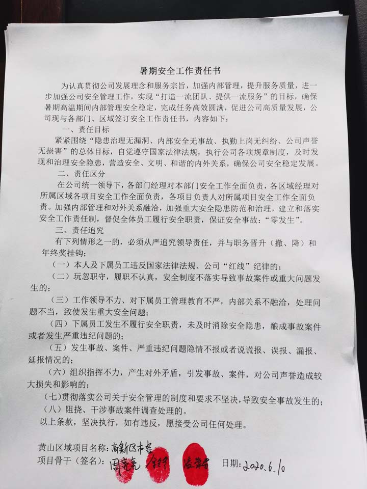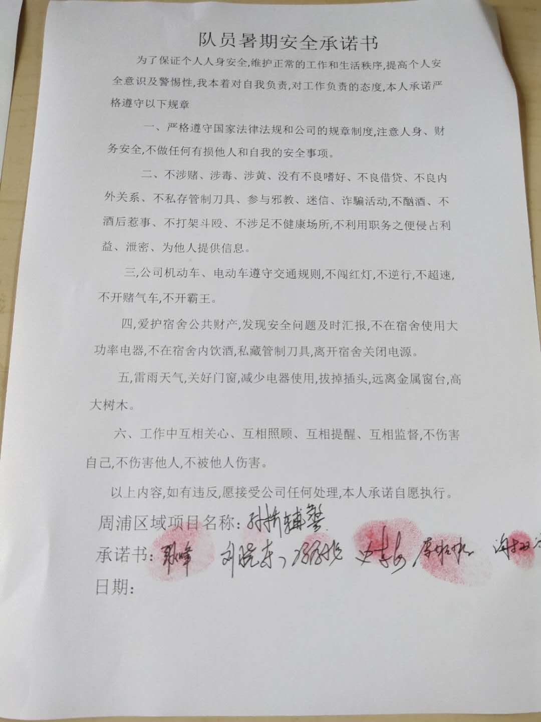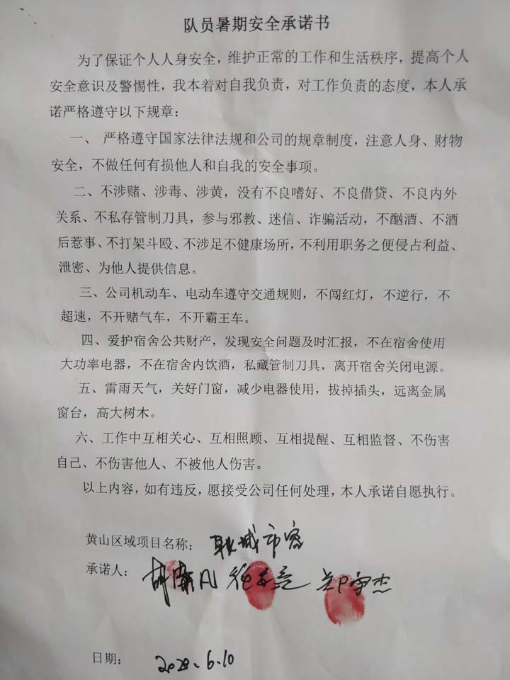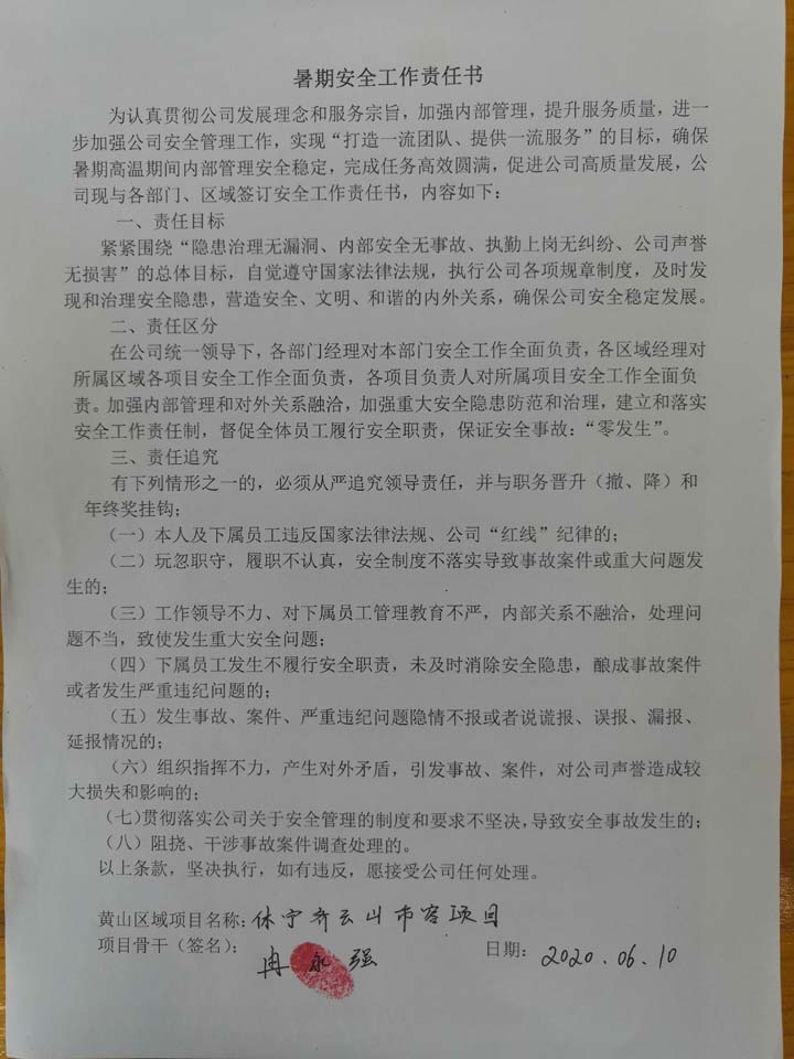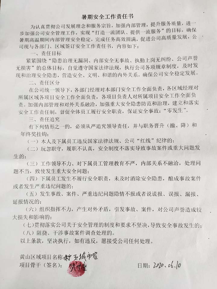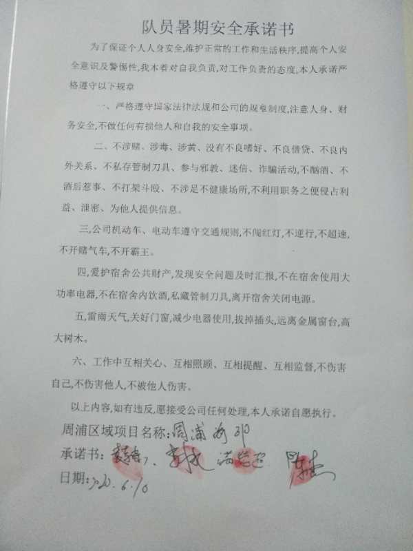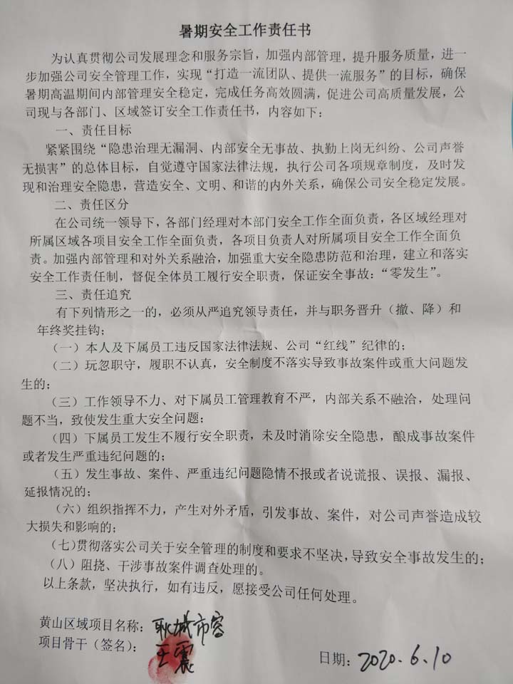 全體員工認真學(xué)習領(lǐng)會(huì )公司暑期安全工作部署會(huì )精神,思想上高度重視,行動(dòng)上堅定自覺(jué),各項目骨干帶頭與隊員簽訂暑期安全承諾書(shū),強化責任意識,筑牢安全防線(xiàn),堅守安全底線(xiàn),確保平穩度夏。