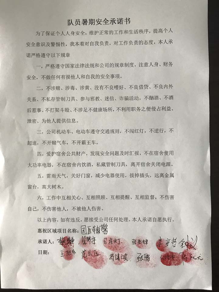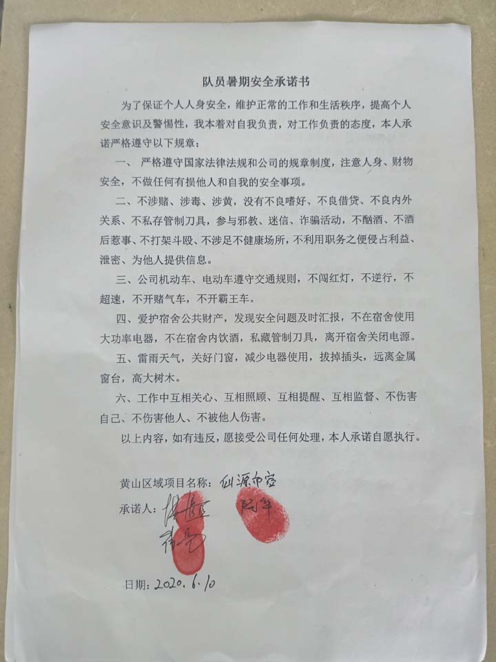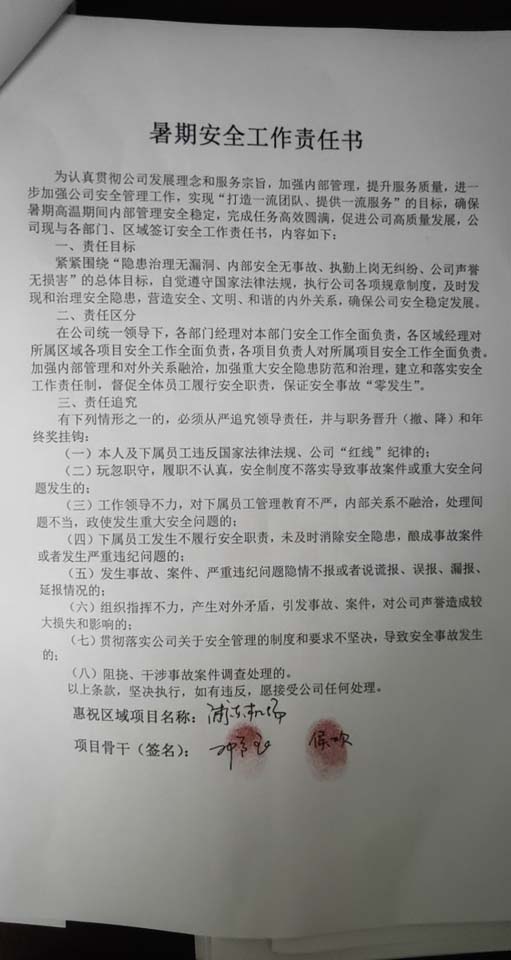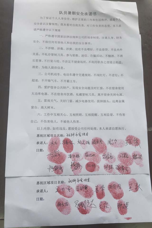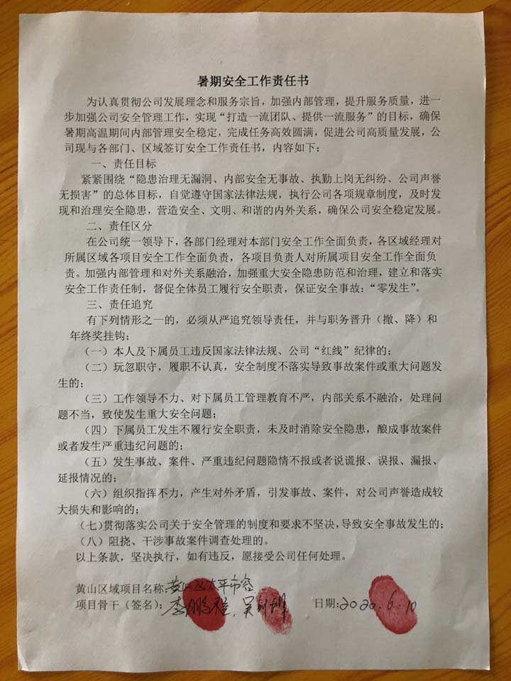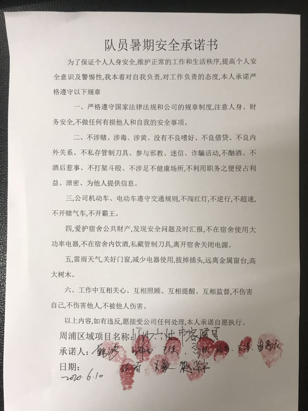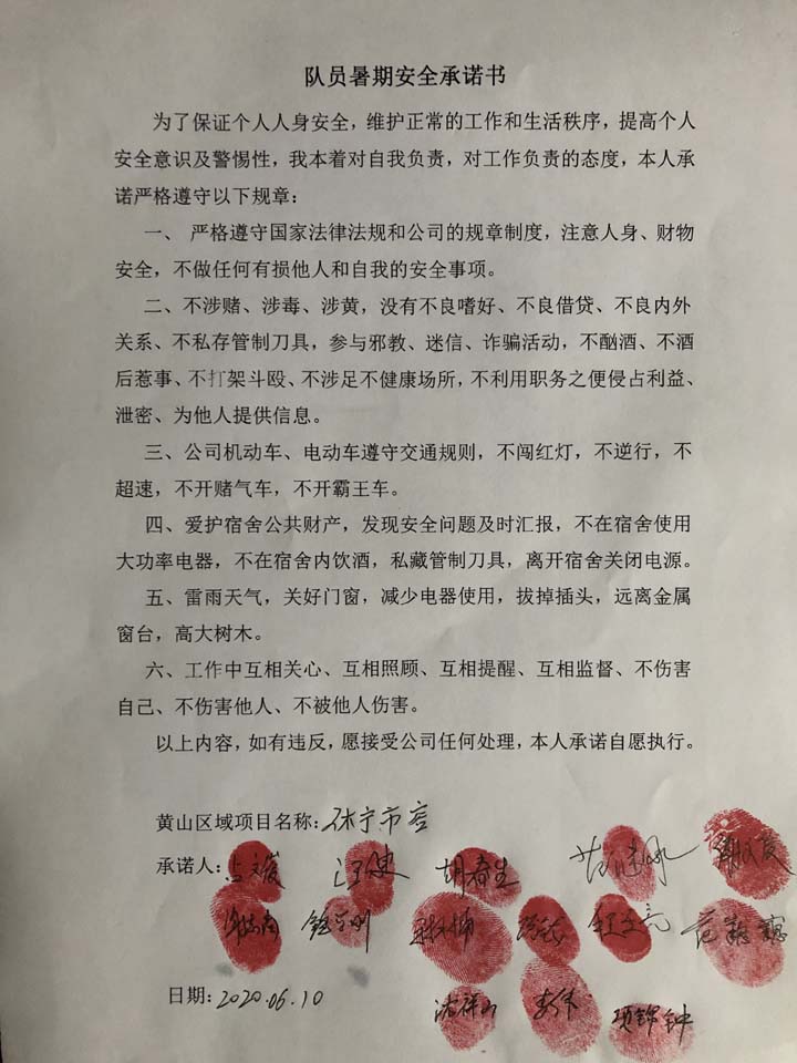 全體員工認真學(xué)習領(lǐng)會(huì )公司暑期安全工作部署會(huì )精神,思想上高度重視,行動(dòng)上堅定自覺(jué),各項目骨干帶頭與隊員簽訂暑期安全承諾書(shū),強化責任意識,筑牢安全防線(xiàn),堅守安全底線(xiàn),確保平穩度夏。