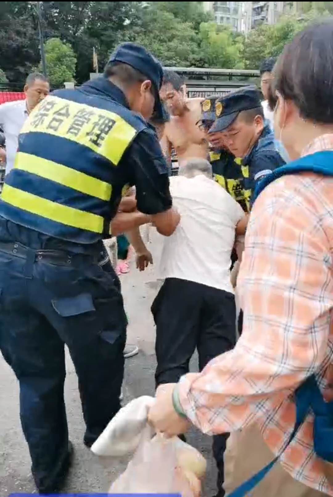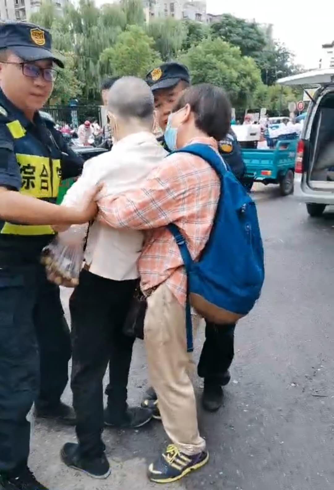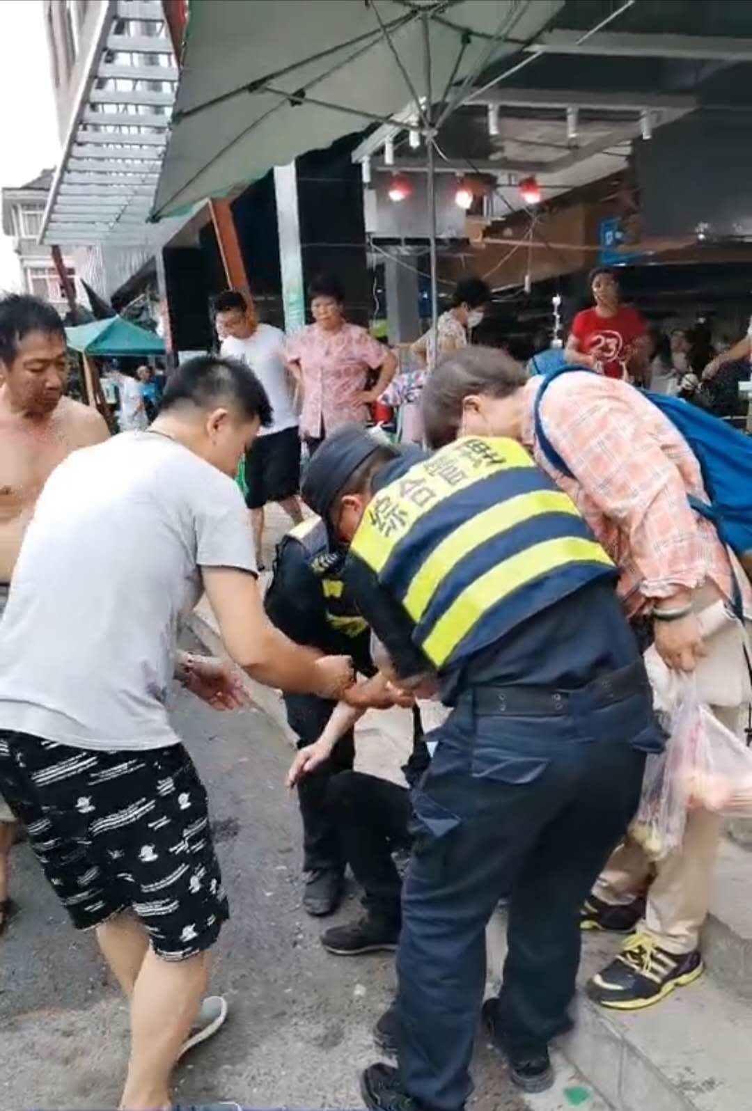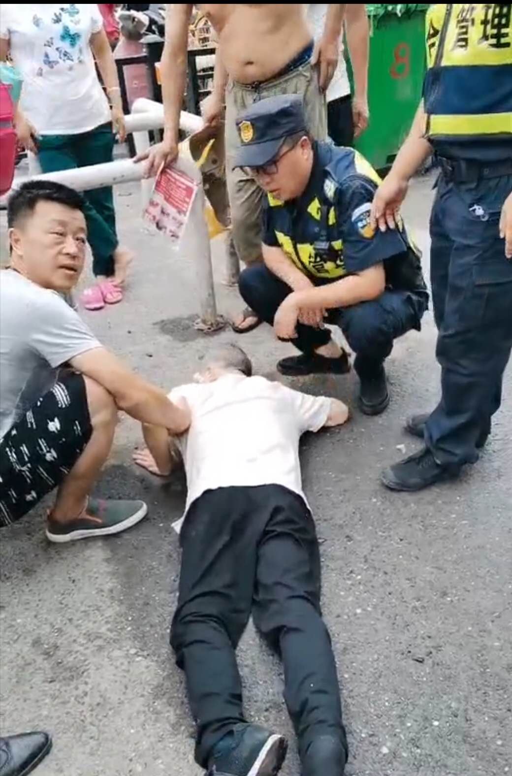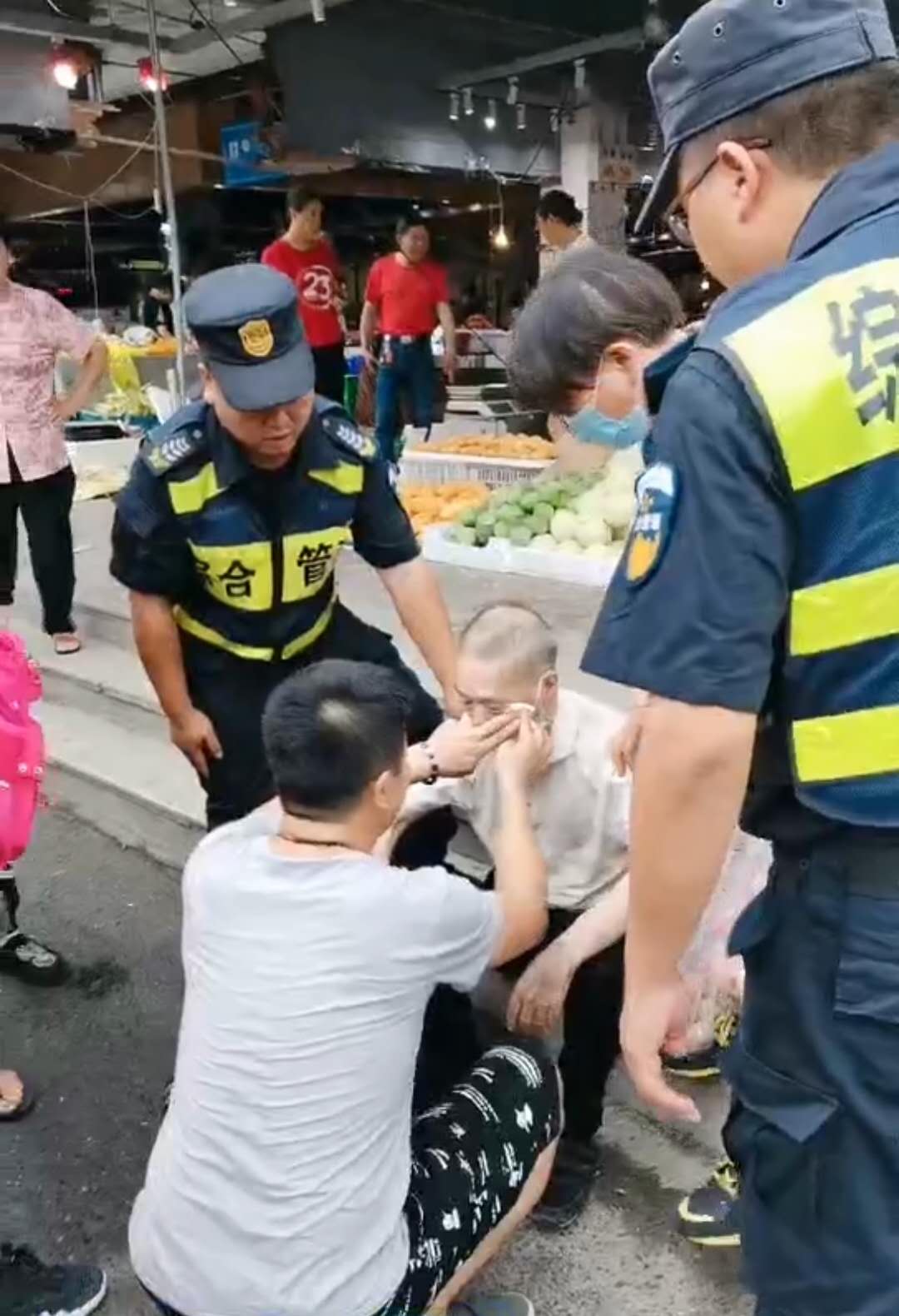 6月15日16:50,民泰公司駐金家渡菜場(chǎng)隊員宋曙光、郭永強、張宗豪巡邏時(shí),一位老大爺突然一個(gè)踉蹌,從臺階上臉朝下摔倒在地。