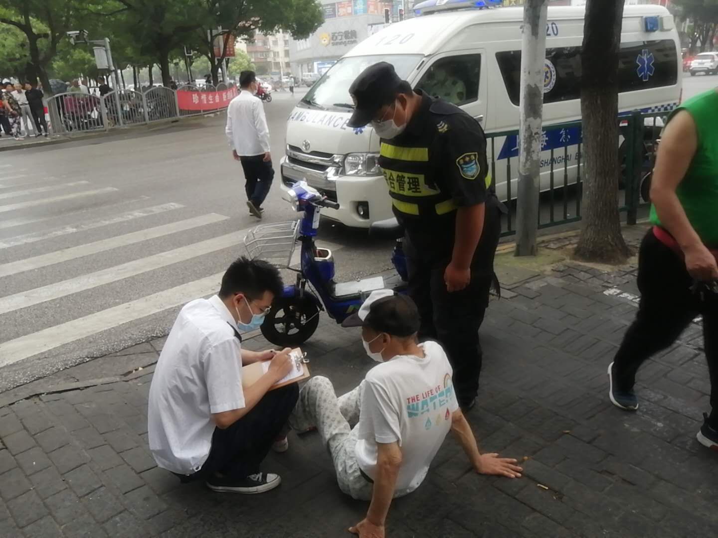 當天15:40左右,鄭世豪和陳睿巡邏到張楊北路清溪路交叉口時(shí),看到一位老人坐在地上,一輛電瓶車(chē)倒在一旁。見(jiàn)此情景,鄭世豪和陳睿急忙跑向前,詢(xún)問(wèn)老人受傷情況。老大爺說(shuō)自己騎電瓶車(chē)避讓行人不小心摔倒了,腿上、胳膊上擦破點(diǎn)皮不要緊,就是覺(jué)得有點(diǎn)頭疼,感覺(jué)腦子有點(diǎn)迷糊。