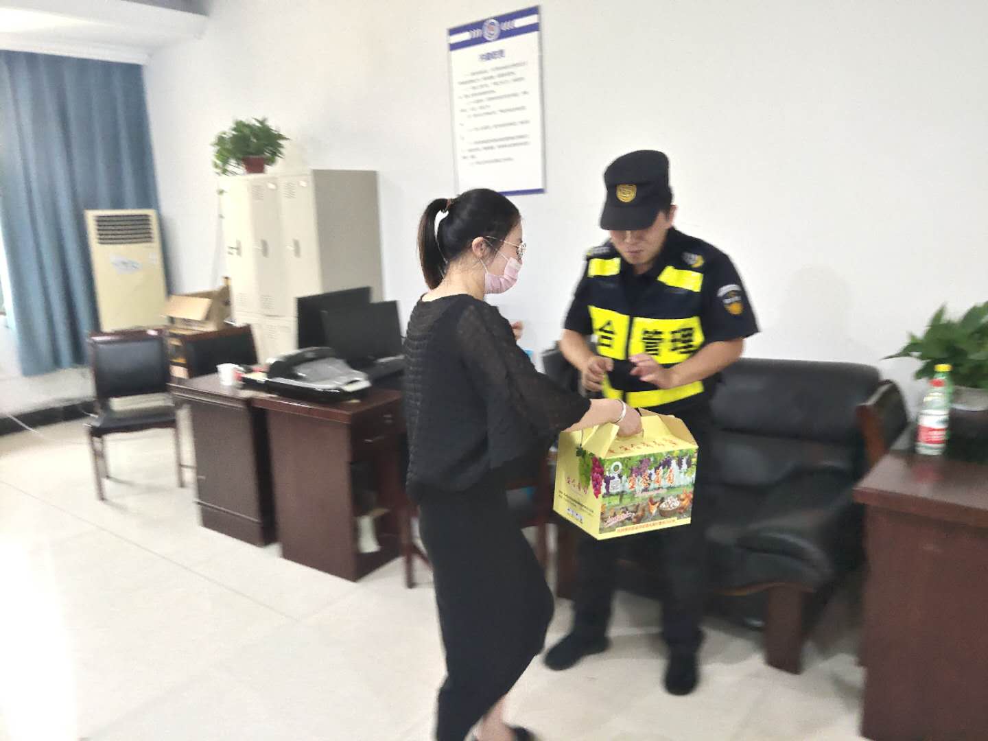 過(guò)了一會(huì ),失主急急忙忙趕到中隊,提著(zhù)一箱葡萄感謝李鑫,被李鑫婉言謝絕,說(shuō)這是自己應該做的。待失主檢查好包內物品后,再次向李鑫表示感謝。