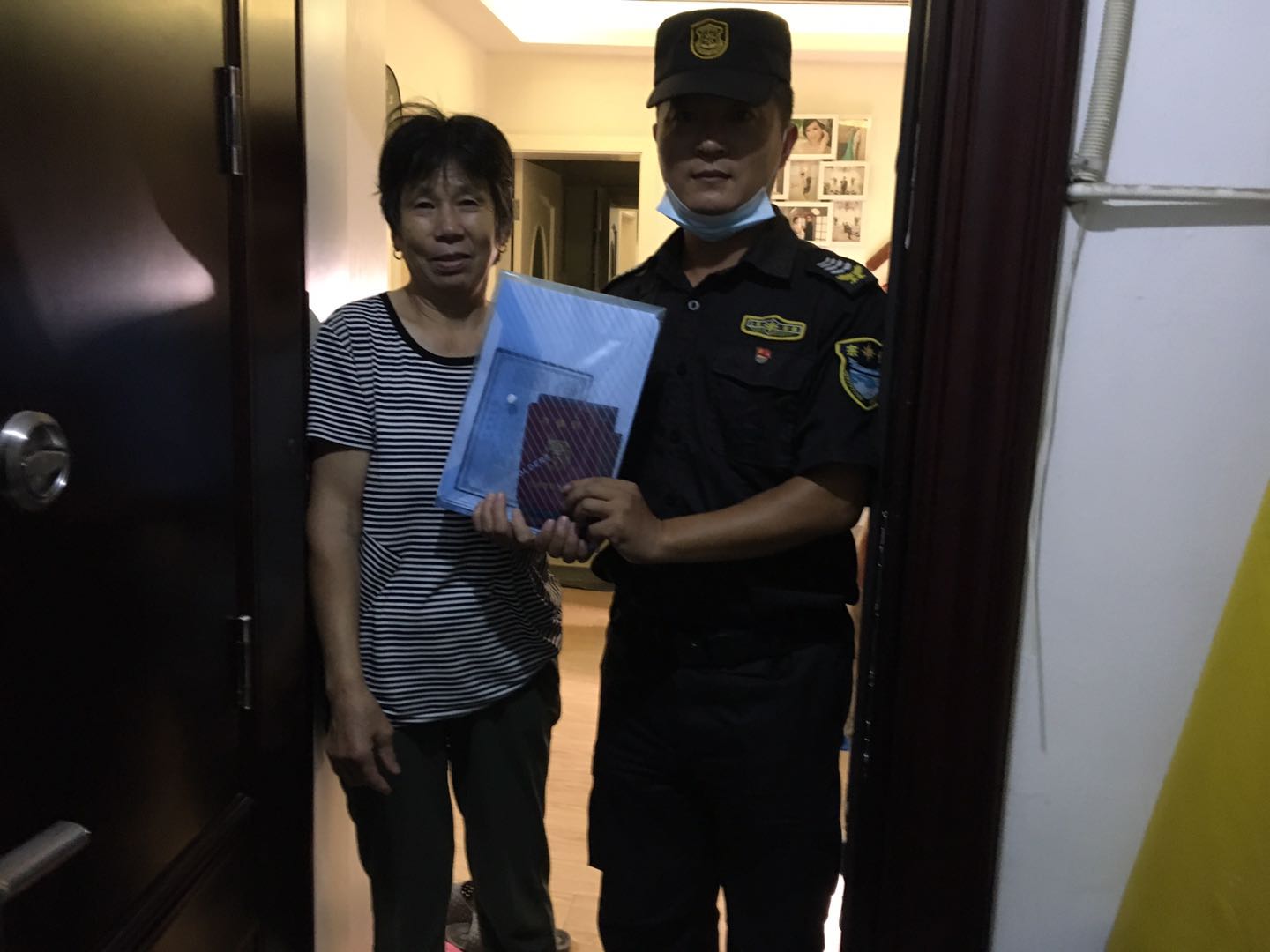 兩位隊員想到失主丟失了證件,一定很著(zhù)急,便按照戶(hù)口本上的地址尋找。功夫不負有心人,終于找到失主,經(jīng)過(guò)核實(shí)確認后,將文件袋還給了失主。