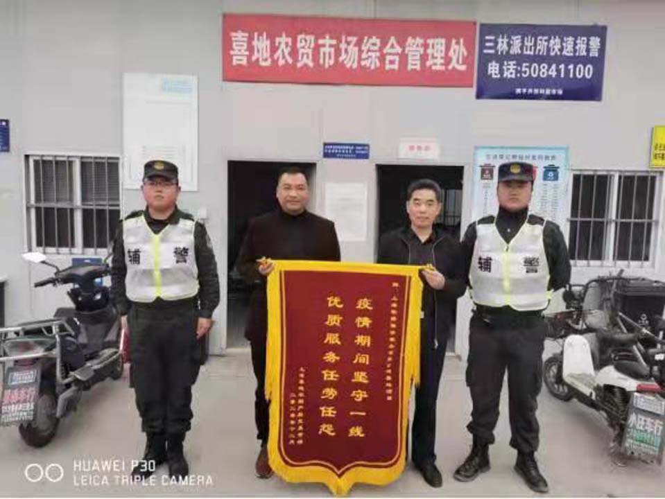12月7日,喜地農貿市場(chǎng)黨委書(shū)記朱福天將一面繡有“疫情期間堅守一線(xiàn),優(yōu)質(zhì)服務(wù)任勞任怨”的錦旗送到宗保公司駐三林喜地農貿市場(chǎng)項目負責人的手中,對宗保隊員在疫情防控期間的優(yōu)質(zhì)服務(wù)表示誠摯的感謝。
